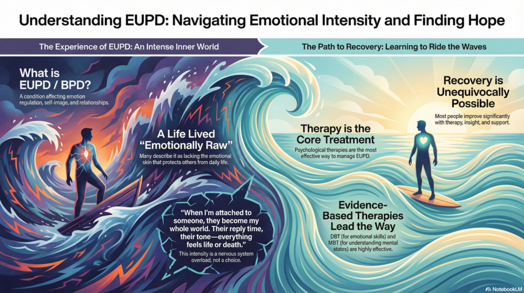 Emotionally Unstable Personality Disorder (EUPD), also commonly known as Borderline Personality Disorder (BPD), is one of the most misunderstood diagnoses in mental health. At its core, it is not about being “difficult” or “manipulative.” It is about feeling everything more intensely, more deeply, and more painfully than most people can imagine.