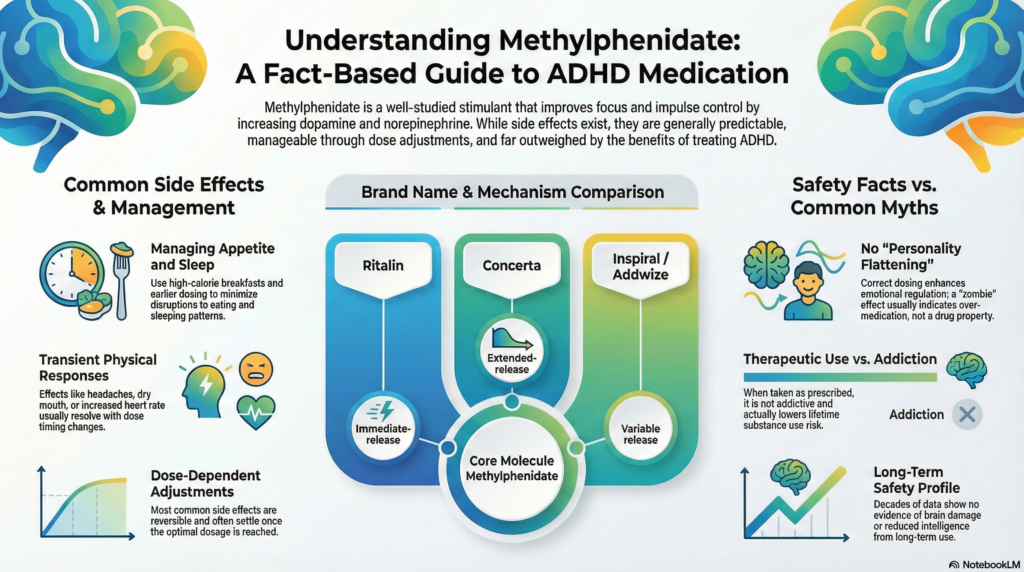 Methylphenidate is one of the most widely prescribed and well-studied medications for Attention-Deficit/Hyperactivity Disorder (ADHD) across children, adolescents, and adults. Despite its long history of use, concerns about side effects remain common—often fuelled by partial information or fear rather than evidence.
