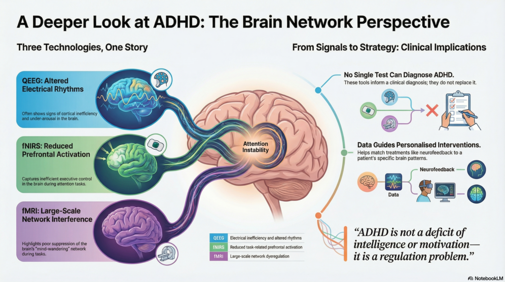 ADHD is best understood as a disorder of brain network regulation, not a focal lesion or a single abnormality. Over the last two decades, three neuroimaging and neurophysiological approaches—QEEG, fNIRS, and fMRI—have helped clarify how attentional control breaks down, even if they do not offer a standalone diagnostic test.