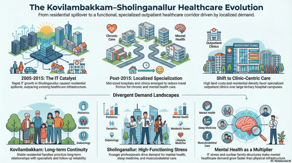 Healthcare in the Kovilambakkam–Sholinganallur belt did not emerge because it was planned. It emerged because people settled, worked, aged, and sought care closer to where life happens.
